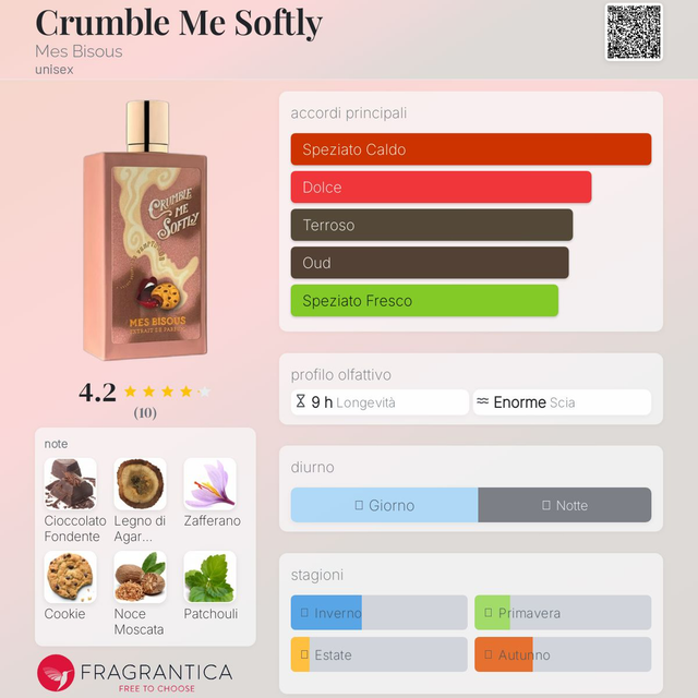 è una fragranza gourmand irresistibile, dolce e sensuale, che avvolge i sensi come un abbraccio proibito. Le note calde di biscotti al cioccolato e caramello si fondono con un cuore intrigante di noce moscata e zafferano, mentre il fondo profondo di ambra, patchouli, oud e muschio lascia una scia magnetica e avvolgente. Crumble Me Softly è il profumo della tentazione: goloso, vellutato e impossibile da dimenticare.
